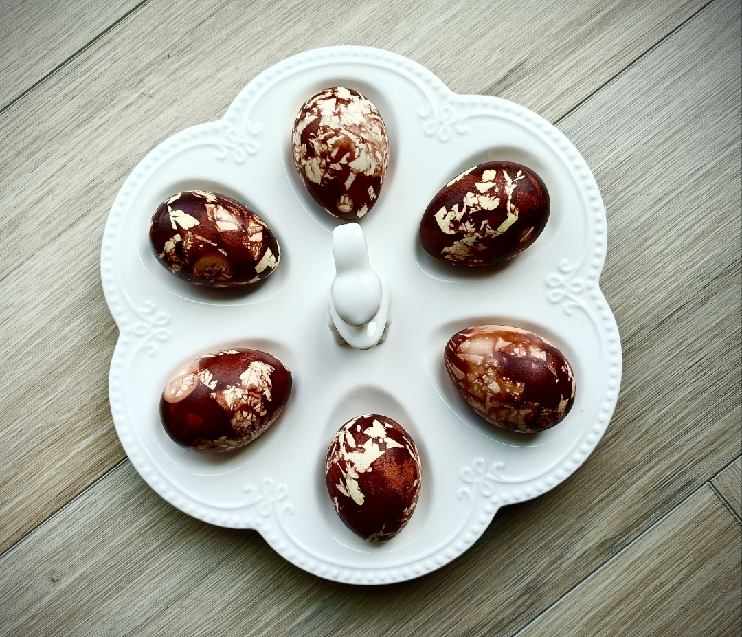 La noi în familie ouăle vopsite se mănâncă, așadar aleg mereu variante cât mai naturale pentru a le colora. Varianta aceasta este vopsită cu frunze de ceapă albă și roșie.