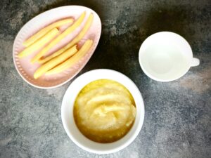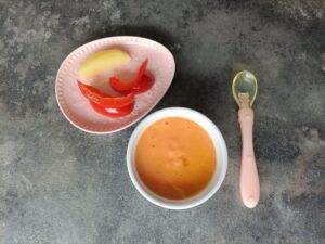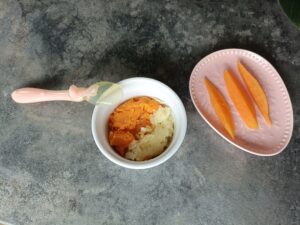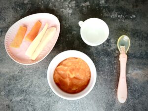 Bronțorica se descurcă bine și preferă fie o textură foarte fină, fie bucăți mari. Este un berbec veritabil și categoric nu acceptă calea de mijloc. Dar, cum spun mereu: planul de diversificare se adaptează în funcție de copil! Fix asta facem și noi: ne pliem pe preferințele ei, pe toleranțele ei, pe disponibilitate, păstrând totuși principiile unei alimentații sănătoase.